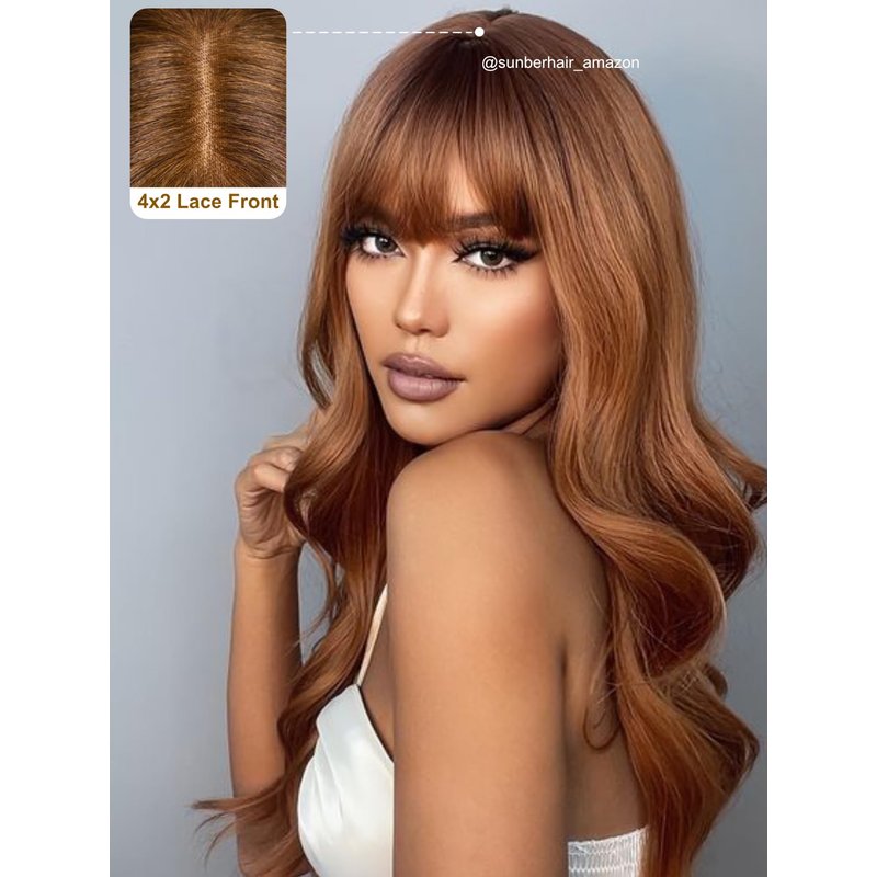 Sunber Yaki Straight 4x2 Lace Closure Chocotlate Brown Yaki Straight with Bangs None Lace Front Wigs 12A Brazilian virgin Hair Wigs with Curtain Bangs Glueless Full Machine Made 180% Density 22Inch