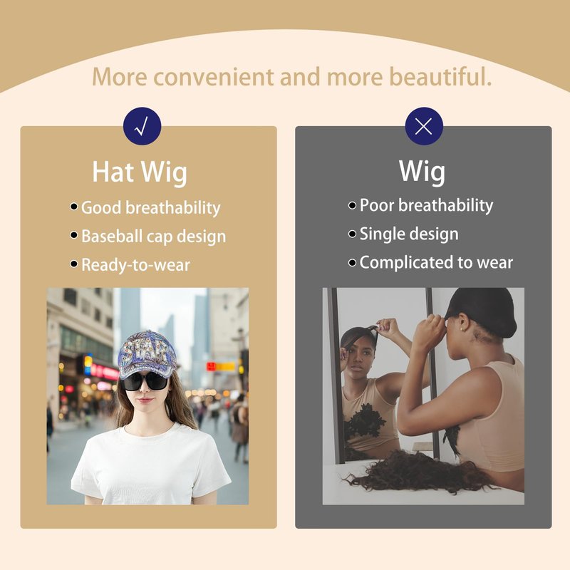 Baseball caps with attached wigs, the ultimate solution for effortless style and convenience. Crafted with high-quality synthetic fibers, our baseball caps ensure breathability and comfort all day long, while the high-quality protein silk wigs add a touch of smoothness and shine to your look. The adjustable strap at the back allows for a customizable fit, accommodating head circumferences of up to 58cm. Plus, each cap comes with a complimentary hair net, making it easy to secure your natural hair underneath for a polished appearance. Perfect for music festivals, parties, or casual outings, baseball cap with hair attached offers versatile styling options to suit any occasion. Say goodbye to bad hair days and hello to instant glamour with our chic and trendy designs. Compact and lightweight, they're travel-friendly and come packaged beautifully, making them an ideal gift for yourself or a loved one. But it's not just about style – our wig hat are designed with functionality in mind. Protect your hair from the sun's rays while staying fashionable, and enjoy the convenience of easy maintenance with hand-washable materials. Experiment with different looks effortlessly, thanks to our variety of wig colors and cap designs. Join SUNBORRY community of fashion-forward individuals who appreciate the perfect blend of fashion and functionality. Elevate your look with our baseball caps with attached wigs and experience the confidence-boosting power of great hair, anytime, anywhere.