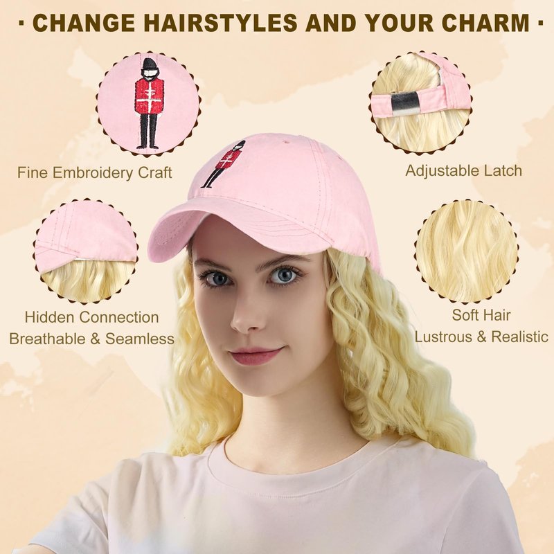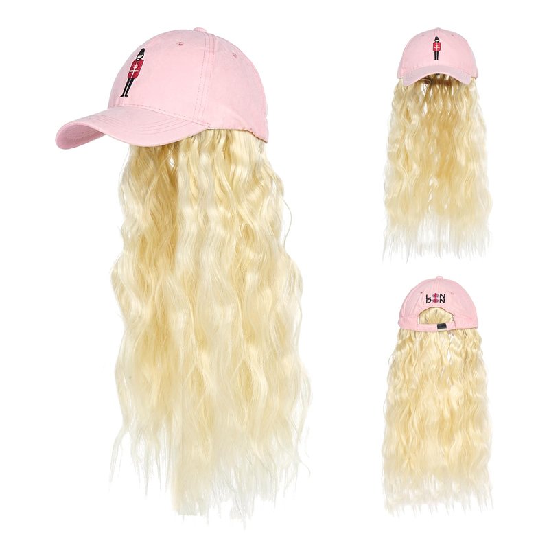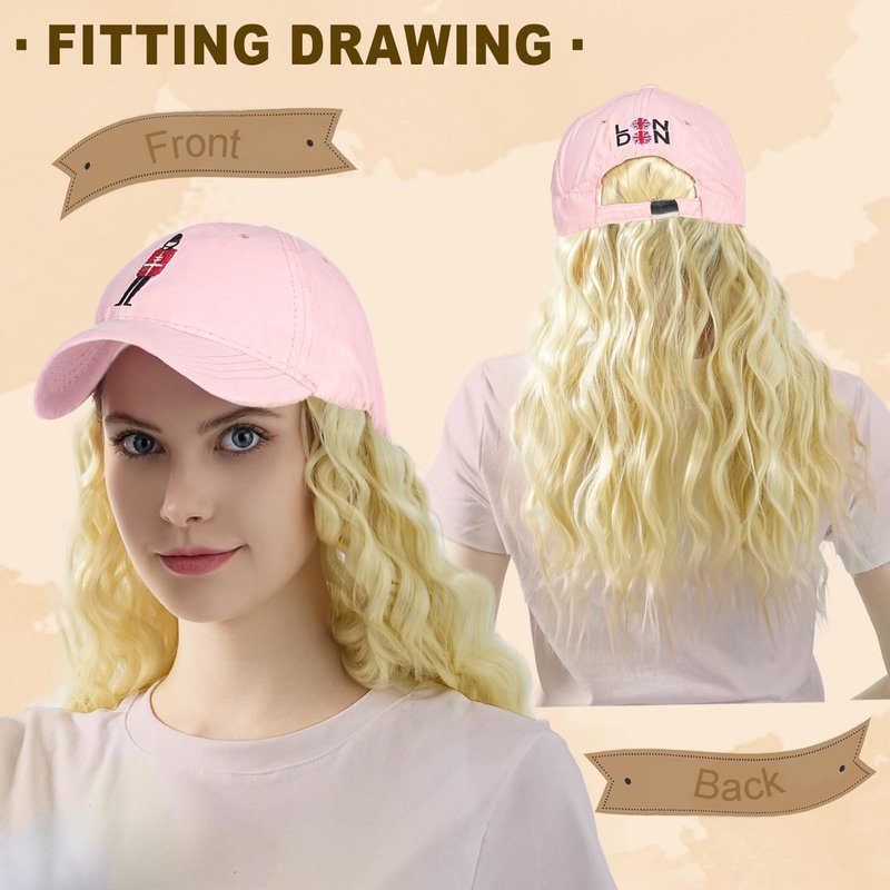 SUNBORRY Women's Wig Hats with Wavy Hair Extensions, Baseball Cap with Hair Attached, 20 Inch (Pink hat-Figure-613 Wool roll)
