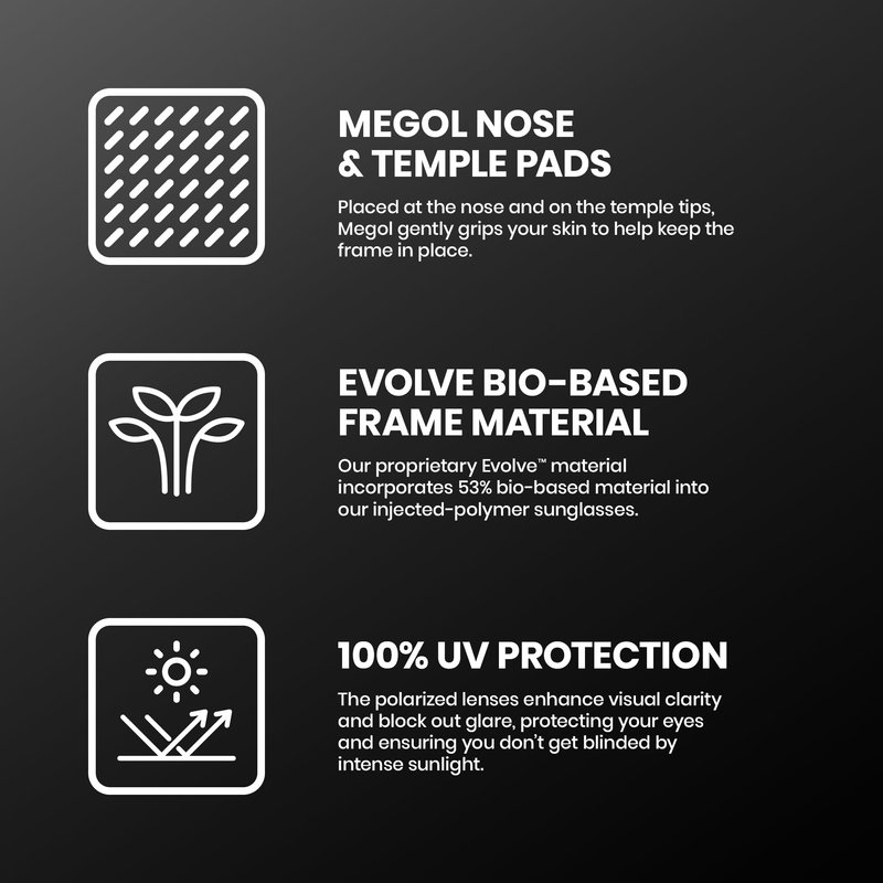 - EVOLVE ECO-MATERIAL: Our proprietary Evolve material incorporates 53% bio-based material into our injected-polymer sunglasses.