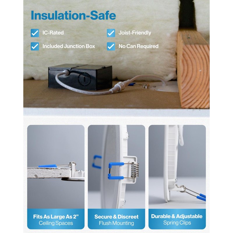 - ✅ IC RATED - Sunco's slim downlights are IC rated, meaning they are thermally protected and won’t overheat or ignite surrounding insulation in the roof or overhead joist space. Both the light and its junction box are safe for direct contact with ceiling insulation.