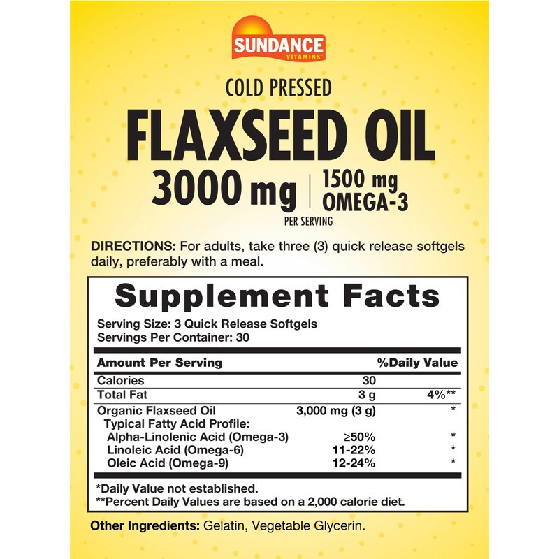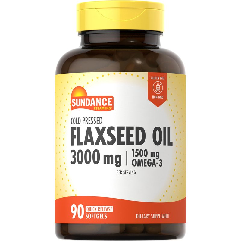 Sundance Flaxseed Oil 3000mg | 90 Softgels | with 1500mg Omega-3 | Cold Pressed | Non-GMO and Gluten Free Supplement