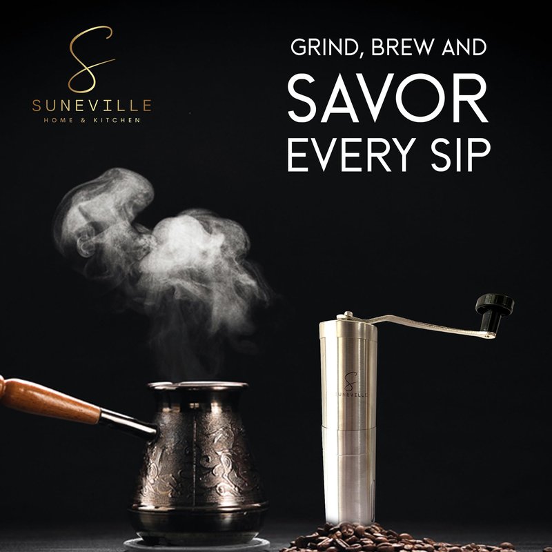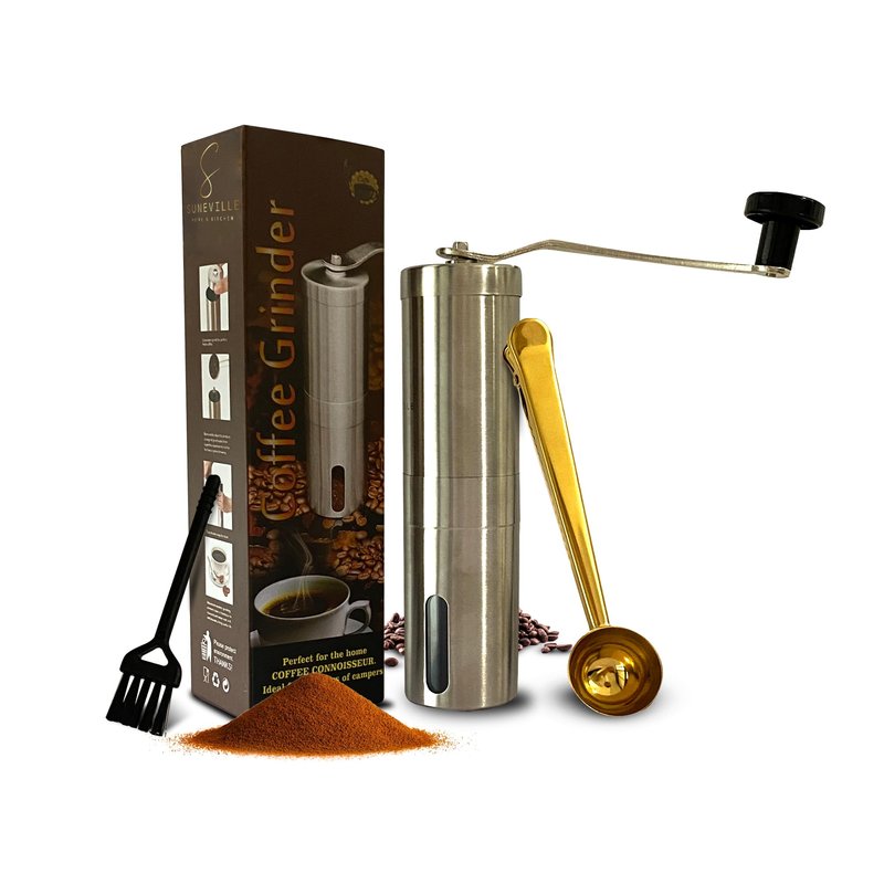 Suneville Manual Stainless Steel Coffee Grinder & Coffee Maker Accessories - Fine to Coarse Grinding Settings - Espresso Tools with Portable Hand Coffee Grinder, Golden Clipper Spoon & Black Brush