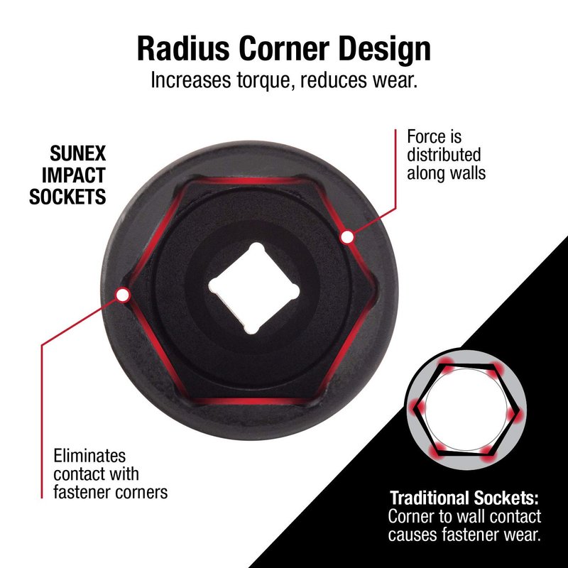 - - RADIUS CORNER DESIGN: Reduces wear and increases torque on fasteners by placing force on fastener walls rather than fastener corners.