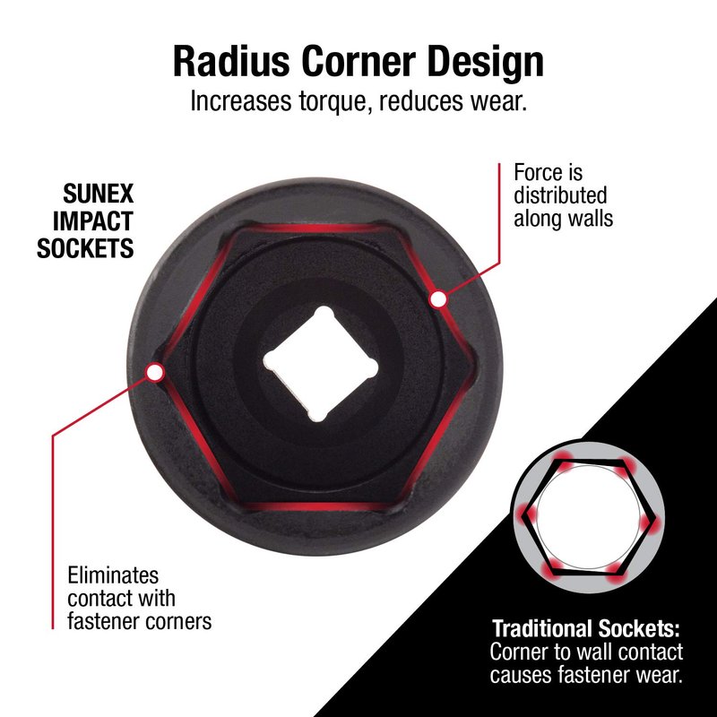 - RADIUS CORNER DESIGN: Reduces wear and increases torque on fasteners by placing force on fastener walls rather than fastener corners.