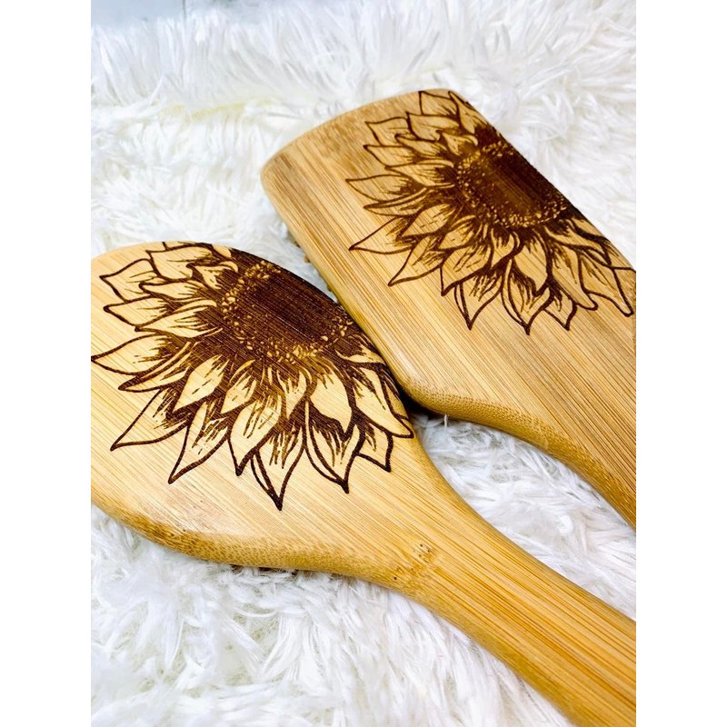We truly believe that all you need this Natural Sunflower Bamboo Wooden Air Cushion Brush Bamboo Bristle Paddle Brush Detangling Hair Brush , made entirely out of wooden materials that are 100% safe for your hair and scalp and 100% friendly towards our environment! SHINY AND SMOOTH HAIR: With natural bamboo bristles, help to condition your hair naturally, distribute your hair’s natural oils evenly. Your hair will look smooth, shiny and silky! ROUND COMBS TEETH: Bamboo bristles with round ends are much gentler and safer. They penetrate and detangle all types of hair effortlessly without pain. Perfect for elderly adults. MASSAGE SCALP - The cushion base and rounded head bristles massage your scalp to ease tension and stimulate blood flow. A healthy scalp provides your hair follicles with more nutrition so that you will have healthier and balanced hair.Daily use helps prevent hair breakage and seal in split ends. MASSAGE MUSCLE – Can use it to tap shoulders, neck and back to relax stiff muscle. ECO-FRIENDLY - Bamboo paddle and bristles are 100% natural and eco-friendly. Natural bamboo hair brush and natural rubber This hair brushes are made from bamboo and natural rubber, and not only are they a more sustainable option for the environment in terms of them being plastic free (even the cushioning bit) and vegan, they are a better option for healthier, shinier hair. Our Bamboo brush is great for women, men and children with long, curly and luxurious hair! Eliminate frizz and introduce a healthy shine to your hair Detangle your hair with zero pain or effort Stimulate blood flow to hair follicles Hair Type: Curly, Thick, Thin, USA engraved by a small business in New Jersey! since each item is engraved separately there may me slight variations in design due to the bamboo grain.