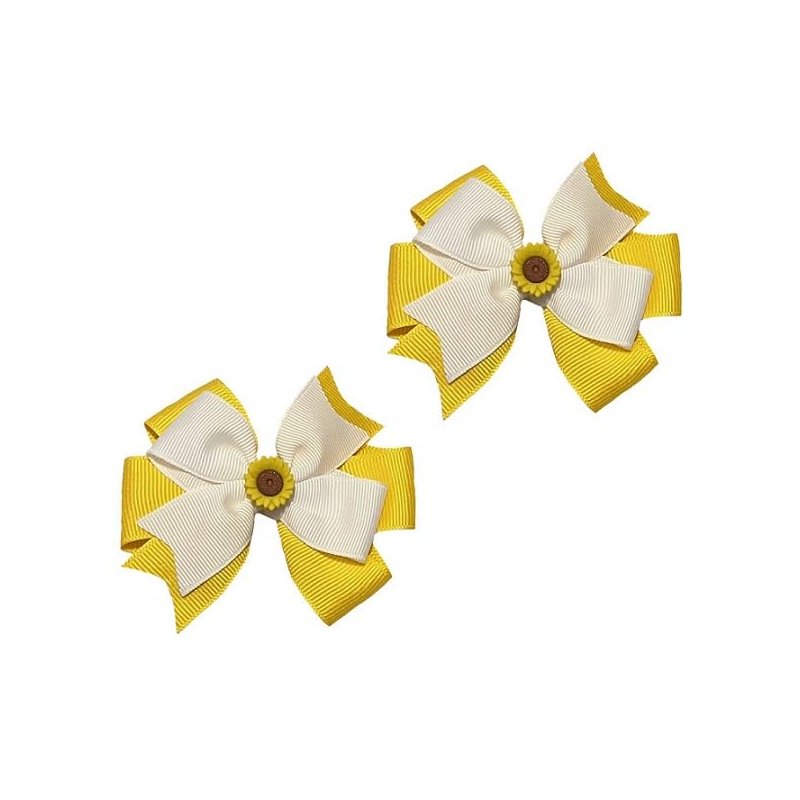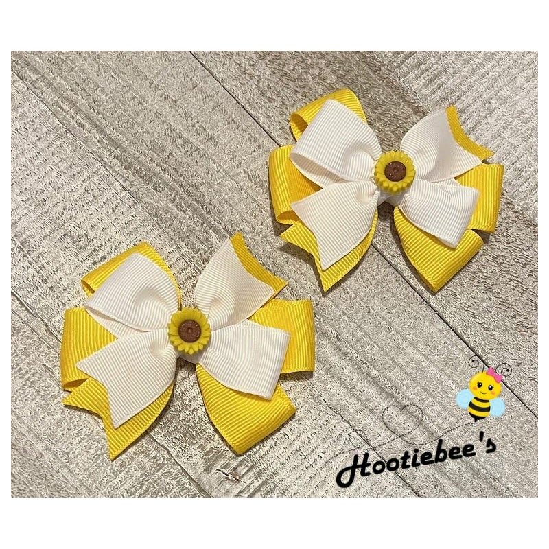 These bows come 2 in a set. Each set consists of one bow for the right side of the head and one bow for the left side of the head. There is a sunflower button in the middle of each bow.
