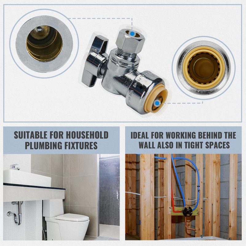 - 【FUNCTOIN】:Pushfit angle stop valve is used to control water flow to the household plumbing fixture and to easily shut off the flow for maintenance and repair if necessary. The easiest and fastest push-fit plumbling fittings to join copper, CPVC, PE-RT or PEX pipe.