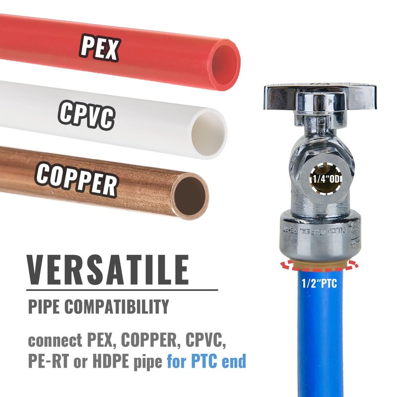- 【LEAD FREE BRASS】:Lead free Chrome-Plated Brass for corrosion resistance, high temperature ductility, not easy to be broken, healthy and safe. Push-to-Connect angle stop valve can be used in Potable Water and Hydronic Heating Applications.