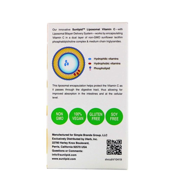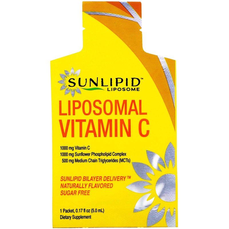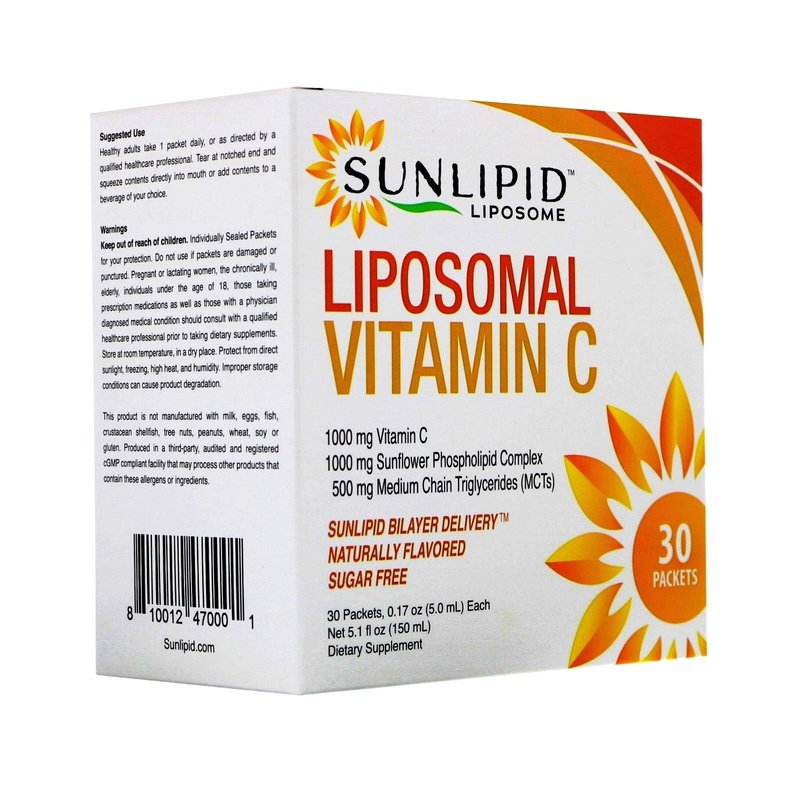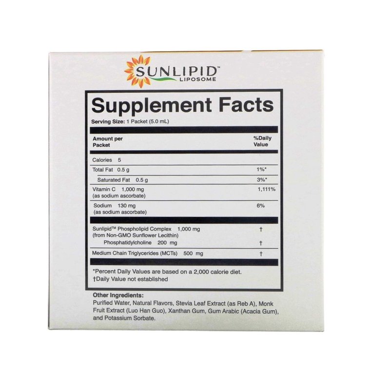 1,000 mg Vitamin C1,000 mg Sunflower Phospholipid, 500 mg Medium Chain Triglycerides (MCTS) SUNLIPID BILAYER DELIVERYYNaturally FlavoredSugar-free, non-GMO, 100% vegan, soy-free dietary supplement. Our innovative liposomal vitamin C with liposomal bilayer delivery system works by encapsulating Vitamin C in a double layer of non-GMO sunflower lecithin complex, phosphatidylcholine and medium chain triglycerides. Liposomal encapsulation helps protect vitamin C as it passes through the digestive tract, allowing for better absorption in the intestines and at the cellular level.