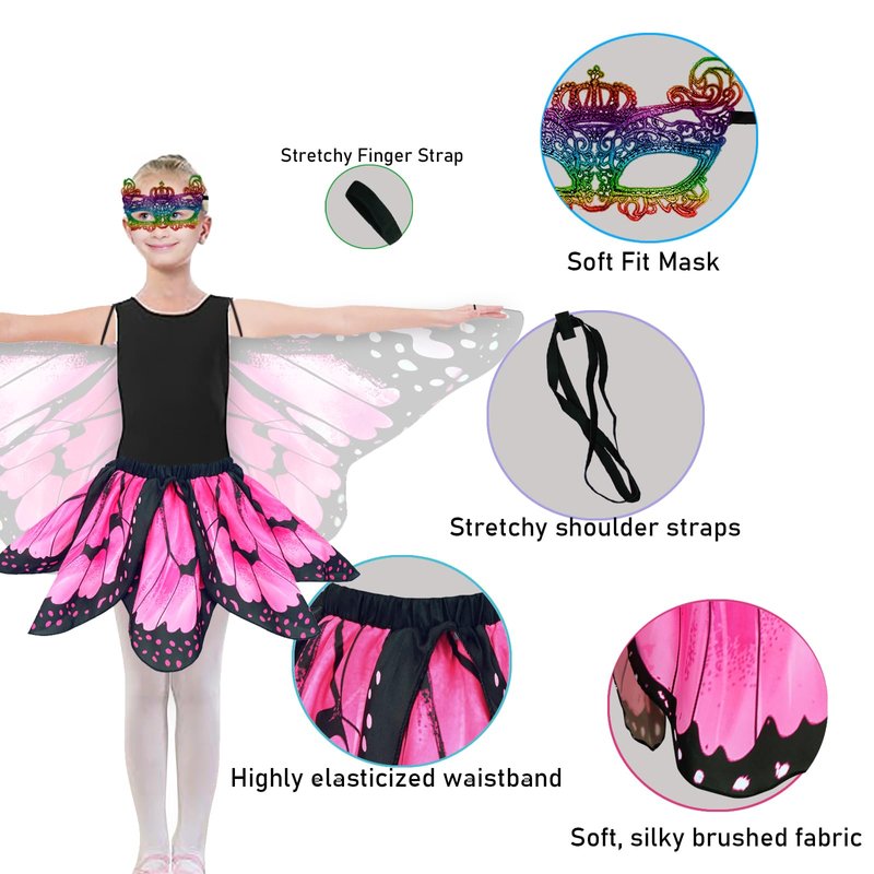 - 【Easy To Wear Take off Store】:This girls butterfly costumes is lightweight, takes up little space and fits easily in your bag. As dress up dresses and butterfly wings toddler are easy to put on and take off, Just attach the elastic band, then wrap the loops around your fingers, put on the mask and gently wave your arms, the soft butterfly cape will fly up like butterfly wings, making you look like a beautiful butterfly fairy. You can swing freely like a butterfly for an immersive effect.