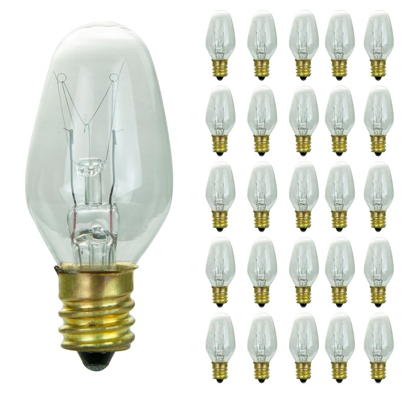 Sunlite 01280 7C7 Incandescent Bulb, 7 Watt, Candelabra E12 Base, C7 Small Night Light, Colored Bulb, Clear, 25 Count
