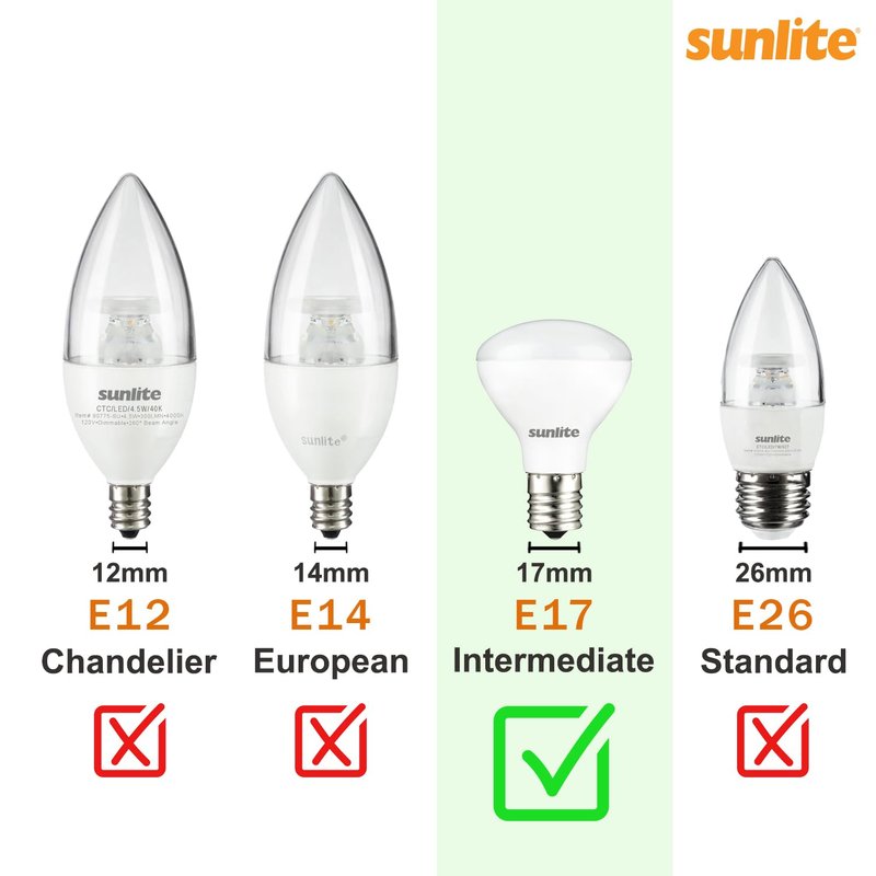 - INTERMEDIATE BASE - With an intermediate base (E17), these bulbs are ideal for use in decorative lamps, nightlights, holiday decorations, appliances, refrigerator freezer microwave Exit light signs, indicators