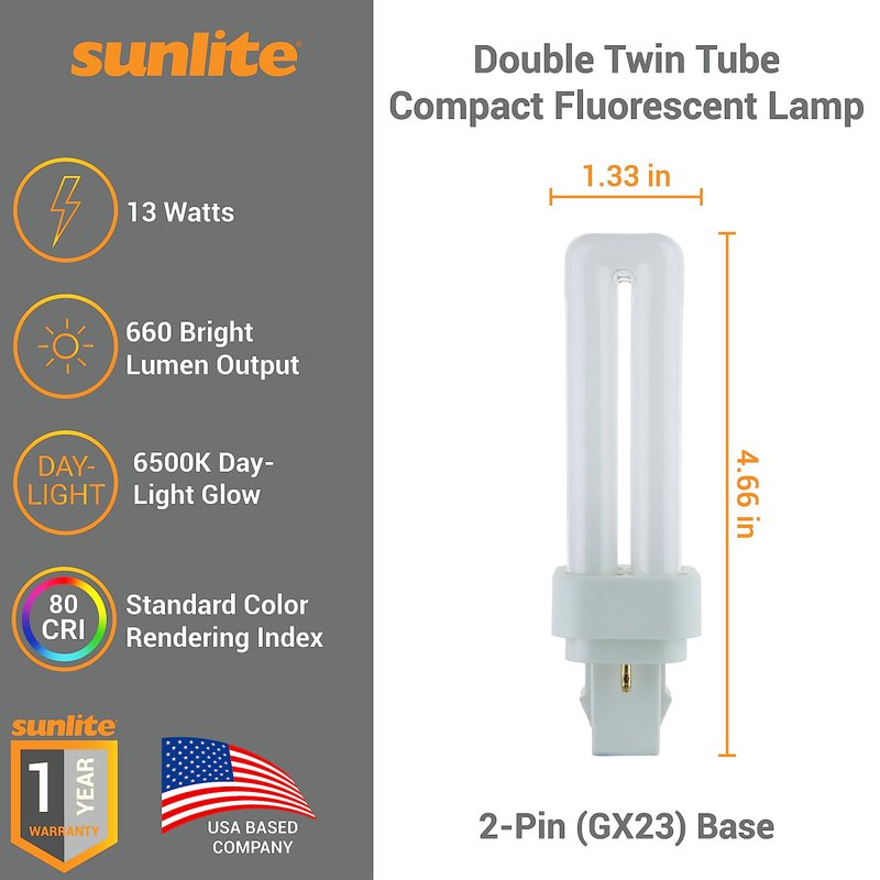 Sunlite 40543 PLD13/SP65K/10PK Double Twin Tube Compact Fluorescent Lamp, PLD 2-Pin, 13 Watts, 660 Lumens, 6500K Daylight, 2-Pin (GX23-2) Base, 10 Pack