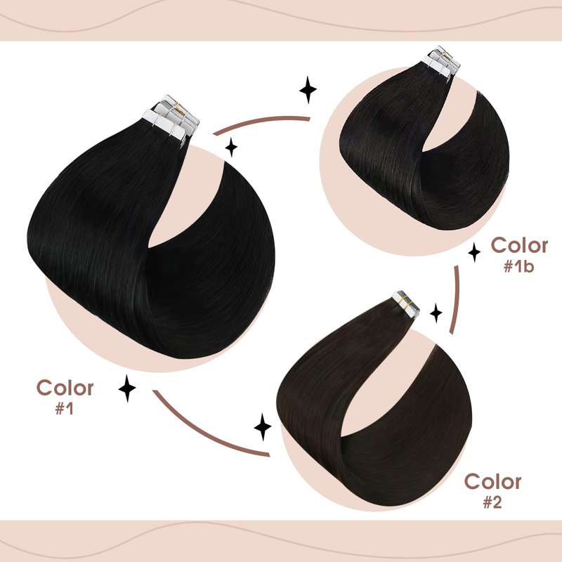 The actual color of the Jet Black Tape in Hair Extensions Human Hair will be slightly different due to the light when taking pictures and the different production batches.