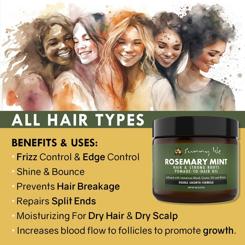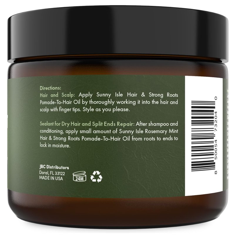 - FEED YOUR HAIR & SCALP: Sunny Isle 100% Natural Rosemary Mint Hair and Strong Roots Pomade-To-Hair Oil is the perfect solution for moisturizing dry scalp and preventing hair breakage while combating frizzy hair, and fighting and itchy dry scalp. Great for natural or transitioning hair, it adds definition and shine to your every style.