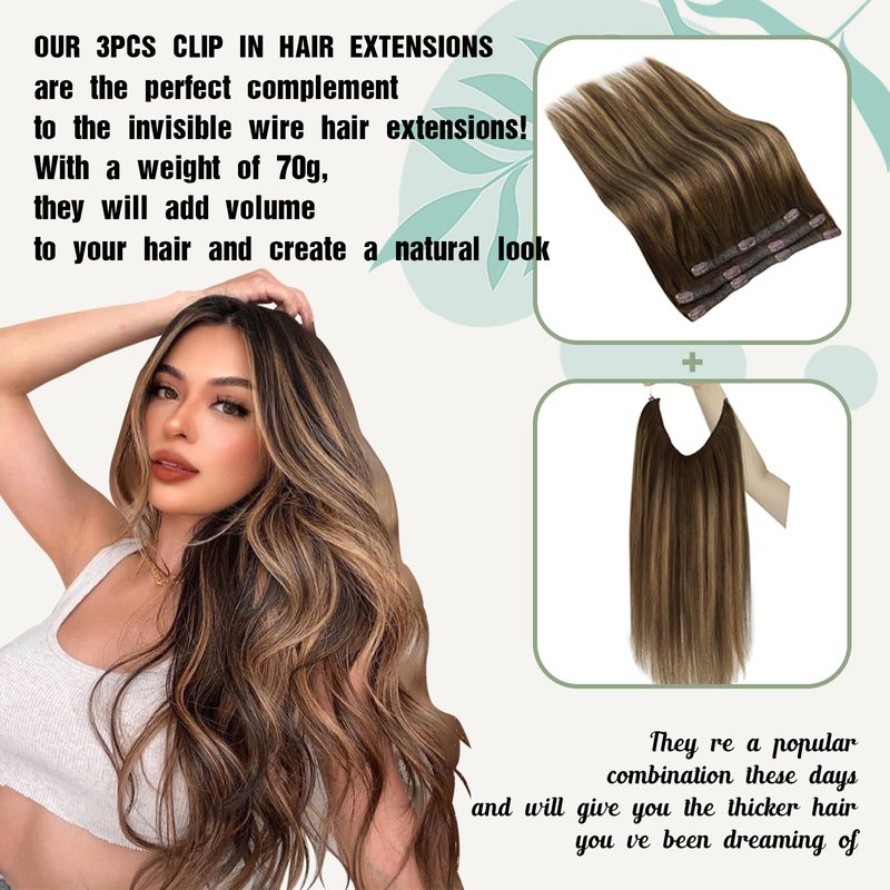 - Versatile and Flexible Usage. Should you feel the need for additional volume, our wire human hair extensions can be effortlessly combined with other extension products, such as 3pcs clip in hair extensions or 7pcs clip in hair extensions. These combinations enable you to achieve your desired hair weight, be it 150-170g or 200-220g, empowering you to create stunning DIY styles with ease.