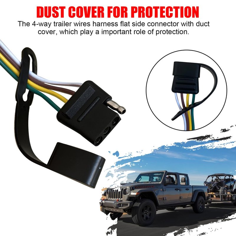 - 4 Pins Flat Vehicle Side Connector: Combinate the 4-pin connector, a 4-pin flat connector use fir lighting functions, including brake lights, turn signals, and running lights.These lights ensure that other drivers can see your intentions and actions while you're towing a trailer, enhancing safety on the road.