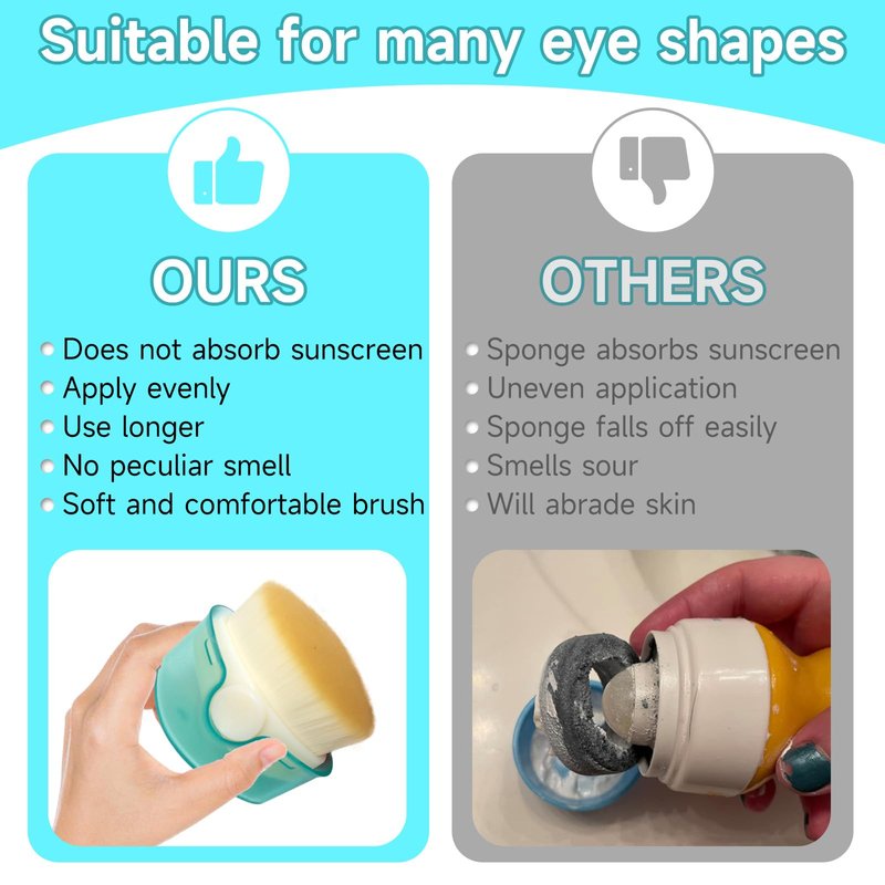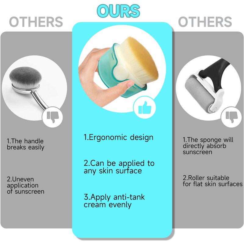 - Bid farewell to the old-fashioned sponge roller sunscreen applicator that leaves your skin at risk! Unlike traditional applicators, our sunblock buddy brush offers a revolutionary approach to sun protection. No more uneven application or wasted sunscreen due to sponge absorption. Say goodbye to sunburns caused by uncontrolled sunscreen application. With our brush, you'll enjoy a clean, hygienic experience without the unpleasant sour smell that often plagues sponge applicators. Plus, our secure cover design ensures no more messy leaks!