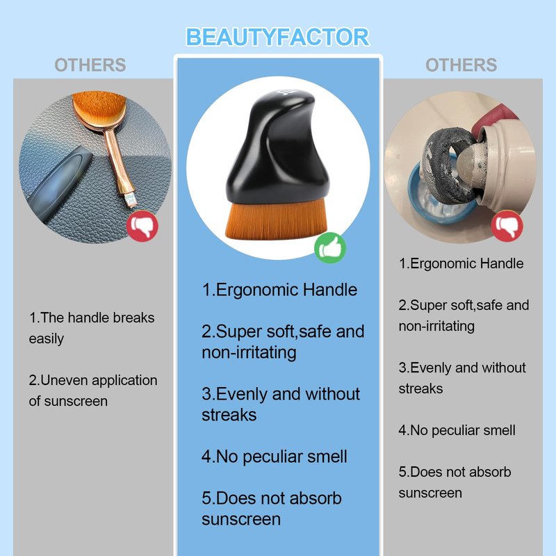 - 【Soft & Dense】BEAUTYFACTOR sunscreen brush is made up of 200,000 high-quality fiber hairs and can be applied to large areas quickly.The sunscreen applicator can accurately control the amount of sunscreen and apply it evenly to achieve perfect sunscreen protection.The sunblock brush won't fall off easily and is reliable for long-term use,the best summer essentials for you.