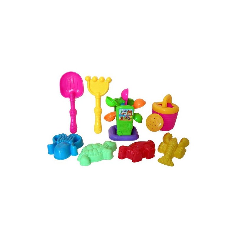 Sand Wheel Toy. 8 Piece Set. Made with the best quality material with your child in mind. Great fun item. Keeps your child entertained and engaged. Great gifts for your little adorable ones. Size: 8" L. Shovel rake watering can and four molds.
