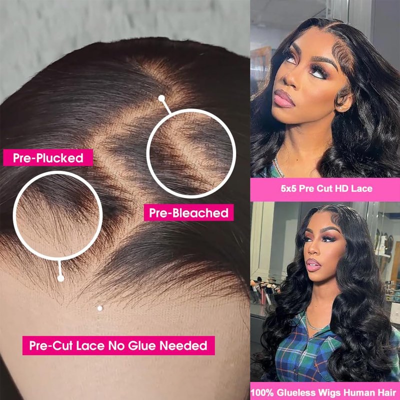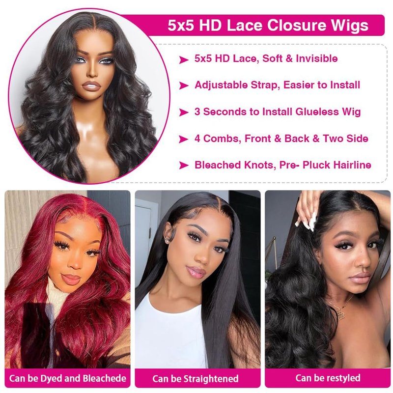 - 【5x5 Lace Closure Wigs Body Wave Advantage】: Glueless 5x5 Hd Lace Closure Human Hair Wigs is Easy To Install, More Healthy, Save Time ,3 Seconds to Install, Quick and Easy, No Skills Needed, Beginner-Friendly. No Glue, No Gel. Pre cut lace glueless wig wear and go, 5X5 Hd lace closure Invisible Lace Area. Pre Plucked Hairline with Baby Hair,Ready to Wear Wigs Glueless Human Hair