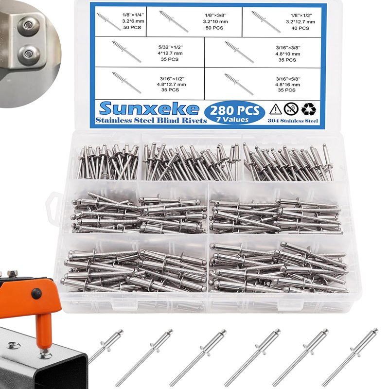 Sunxeke 280pcs Stainless Steel Blind Rivets, 7 Values 304 Stainless Steel Pop Rivets Assortment Kit