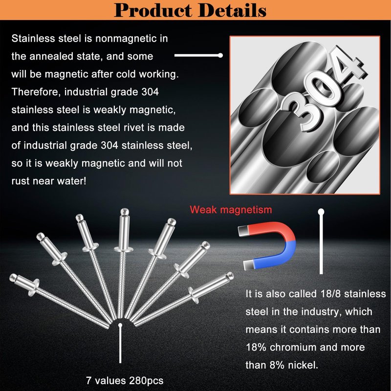 - 【Material】304 stainless steel is called 18/8 stainless steel, which means that it contains more than 18% chromium and more than 8% nickel, while chromium-nickel stainless steel is generally nonmagnetic in the annealed state, and some will be magnetic after cold working. Therefore, industrial grade 304 stainless steel is weakly magnetic, and this stainless steel rivet is made of industrial grade 304 stainless steel, so it is weakly magnetic and will not rust when it is near water!