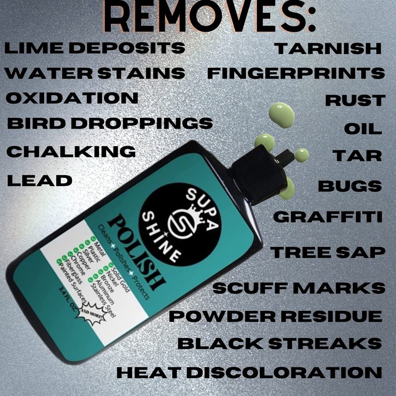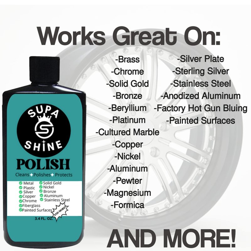 Supa Shine is an all in one metal polish, brass cleaner, chrome polish, aluminum polish, stainless steel polish, gold polish, stainless steel scratch remover (light scratches), silver polish cleaner and much more! Use to restore headlights, remove water stains from sink and faucet, golf club polishing kit, chrome polish for cars, chrome polish for motorcycle, knife and sword polishing, coin polishing kit, alloy wheel polish, rim polish, cleaner for bronze grave marker, jewelers oil, fiberglass polish for bathtub, aluminum boat polish and silver polish for brass instrument. Safe, non- toxic, non- flammable, non- abrasive and made in the USA. Works as a great: copper cleaner and polish, brass cleaner and polish, chrome cleaner and polish, stainless steel scratch removal (light scratches), liquid metal polish cream, liquid aluminum polishing compound, heavy metal polish, liquid polishing paste, rust polish, slver polish, plastic cleaner and restorer. Common use cases include: guitar and instrument polishing, truck polish, brass insturment polish, stone polishing cream, oxidation remover aluminum, marine aluminum restorer and polish, clean silver plate, fine glass polish, wood stove polish, alloy wheel wax, copper sink care, cemetary marker cleaner, oxidation remover for fiberglass, galvanized metal cleaner, rust remover golf, best chrome cleaner and polish, metal gloss polish, chrome oxidation remover, instant golf club scratch remover (light scratches). Supa Shine is the 2022 new metal polishing paste (liquid) you've been looking for and makes the perfect aluminum cleaner & brightener & restorer, watch polish, sword cleaning kit, exhaust tip cleaner, cooper cleaner and polish, metal polih, rim polish allow, aluminum brightener, cemetery marker cleaner, and more. Pulidor de plata, crema para pulir, crema pulidora de autos. This ultimate metal polishing cream (liquid) is a wonderful aluminum restoration solution, tarnish remover, polished brass cleaner, & deoxidizer.
