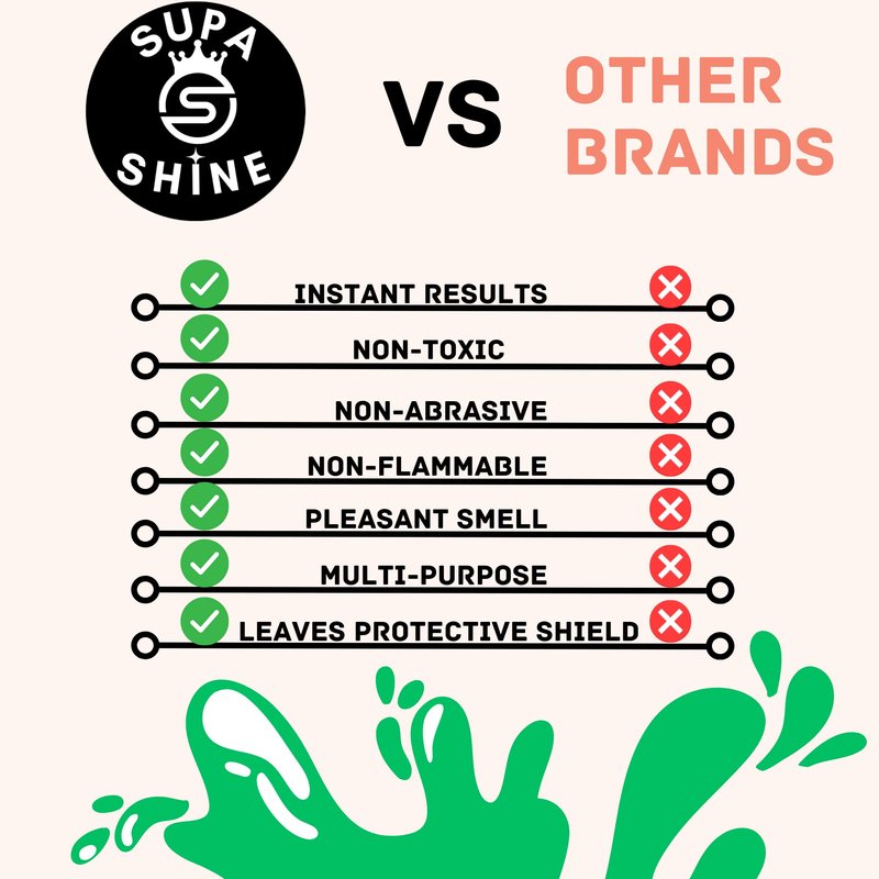 - Safe: Most cleaners can't say they are effective for cleaning the rustiest tools in your garage while also 100% safe when used on food preparation surfaces, but Supa Shine can! Supa Shine is non- toxic, non- flammable, non-abrasive & made in the USA.