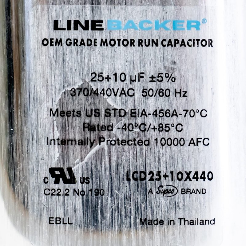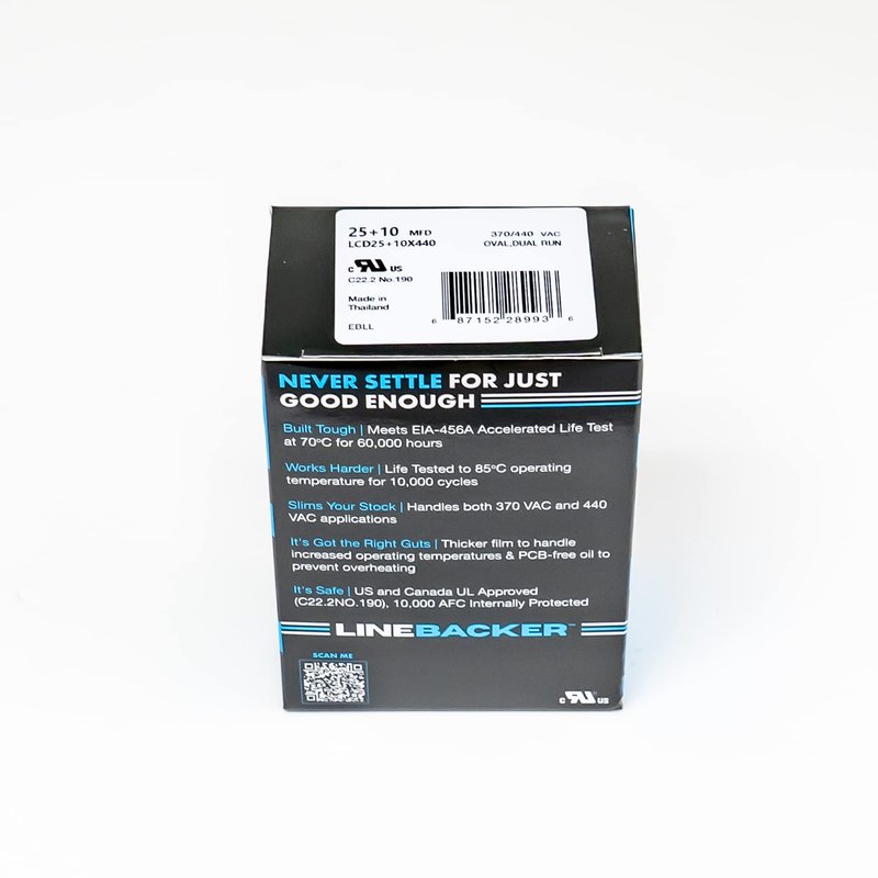 Linebacker Motor Run Capacitors are built for longevity and performance. Engineered by an ISO certified manufacture with over twenty years experience in OEM capacitor fabrication. Linebacker capacitors come off the same production line as the OEM, and are 100% in-line production tested to the same rigorous international standards. Linebacker capacitors are manufactured with thick polypropylene foil to handle increased operating temperatures.