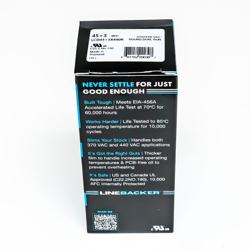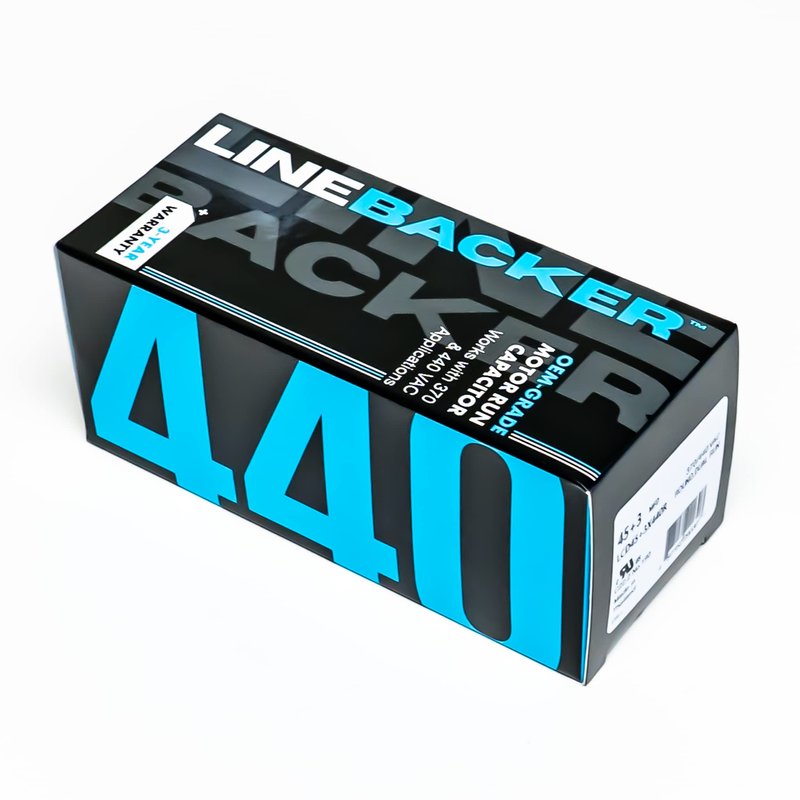 Linebacker Motor Run Capacitors are built for longevity and performance. Engineered by an ISO certified manufacture with over twenty years experience in OEM capacitor fabrication. Linebacker capacitors come off the same production line as the OEM, and are 100% in-line production tested to the same rigorous international standards. Linebacker capacitors are manufactured with thick polypropylene foil to handle increased operating temperatures.