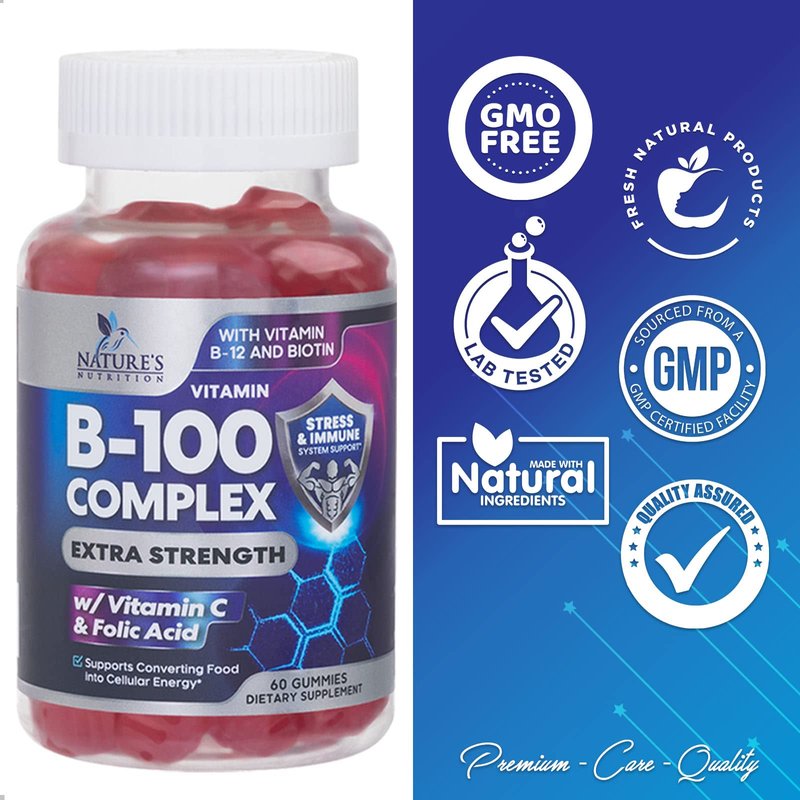 - Extra Strength 6 B Vitamin Complex: Our Nature's Nutrition B Complex Gummies contain 6 essential B vitamins; Niacin, B6, Folic Acid, B12, Biotin & Pantothenic Acid