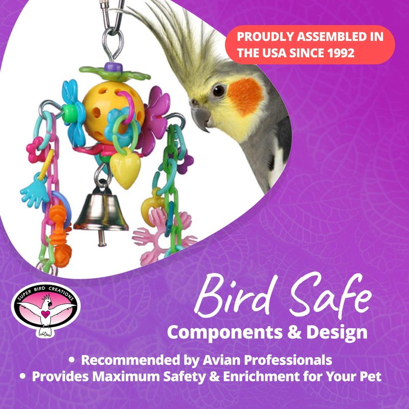 - SUITABLE FOR SMALL TO MEDIUM BIRDS: The Super Bird Creations Birdie Bouquet is expertly crafted for Parrotlets, Parakeets, Cockatiels, Lovebirds, and similar-sized birds, providing a stimulating and safe play environment.