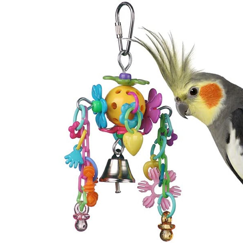 - VIBRANT DESIGN FEATURES: Over 30 engaging parts including charms, pacifier beads, star rings, and a bell make this bird toy a captivating addition to any cage. Its colorful design and bird-safe pear link make it a standout in bird toys.