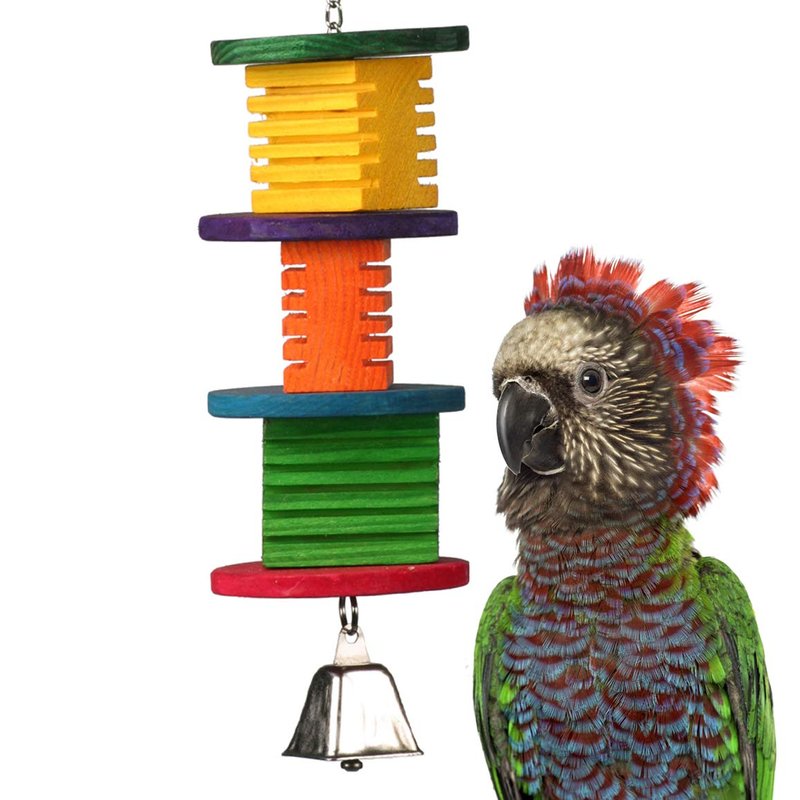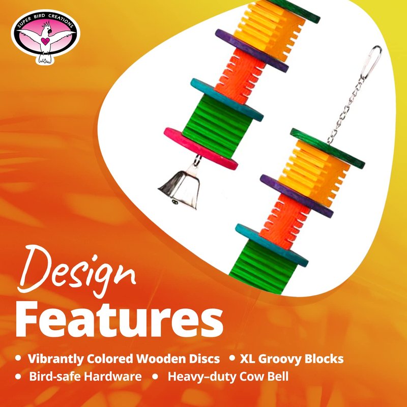 - INTERACTIVE PLAY ELEMENTS: Loaded with colorful xl groovy wooden blocks, crunchy wooden discs, and a cow bell, the Disco Fever Bird Toy entices your bird to chew, climb, and explore. It is also equipped with a durable chain and quick-link. The variety of textures and shapes promote healthy chewing habits and stimulating your bird’s auditory sense, ensuring your bird is both mentally and physically engaged.