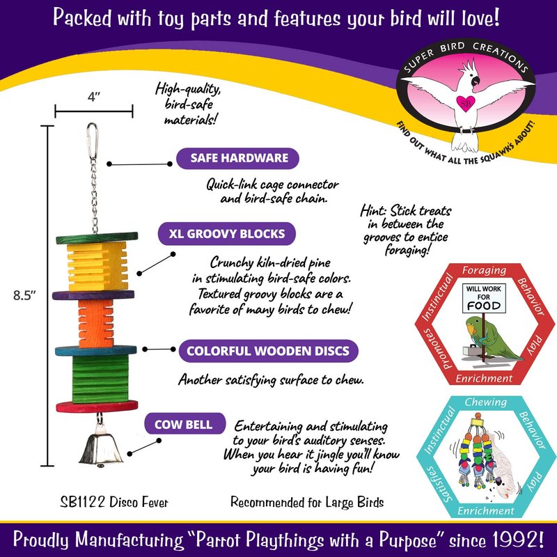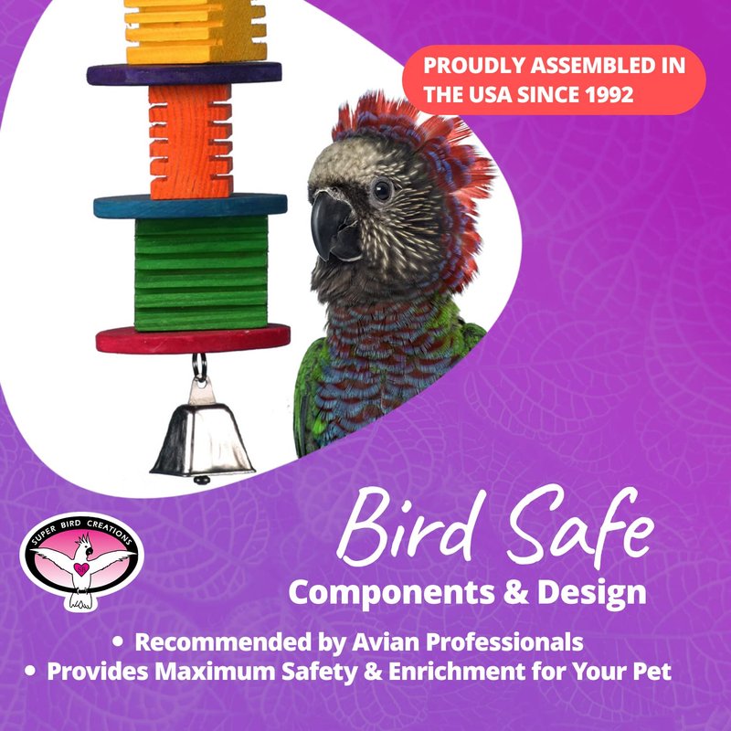 - PROFESSIONALLY RECOMMENDED: Endorsed by avian professionals worldwide, this toy is made with the finest components, ensuring maximum safety and enrichment for pet parrots. Bird owners can trust in the quality and safety of Super Bird Creations' products for their beloved pets. Intended for Pet-Use only.
