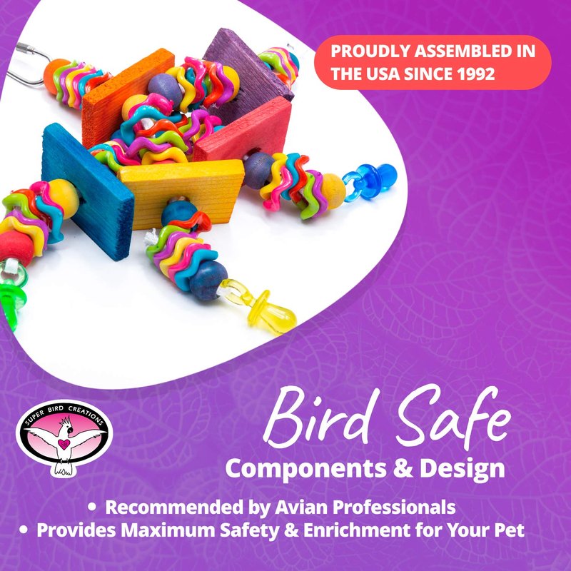 - SAFE & EXPERTLY DESIGNED: Trusted by avian professionals worldwide, our bird toys are expertly crafted with bird-safe components and design. Your bird's safety and enrichment are our top priorities. Proudly assembled in the USA since 1992, you can trust in the quality and care that goes into every Super Bird Creations product. Intended for Pet-Use only.