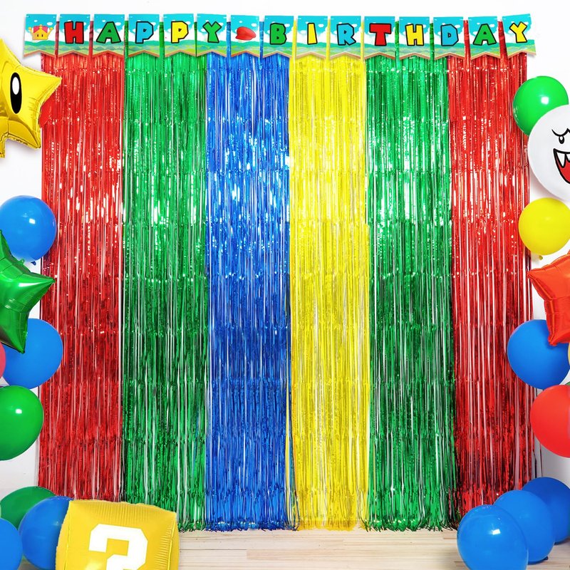 - šćPerfect for Super Bros Birthday Party Decorationć Planning a Video Game Mario Theme party for a birthday, baby shower, or other celebration? These awesome Red Green Blue Yellow metallic foil fringe curtains will have your guests ready to share videos about your event.