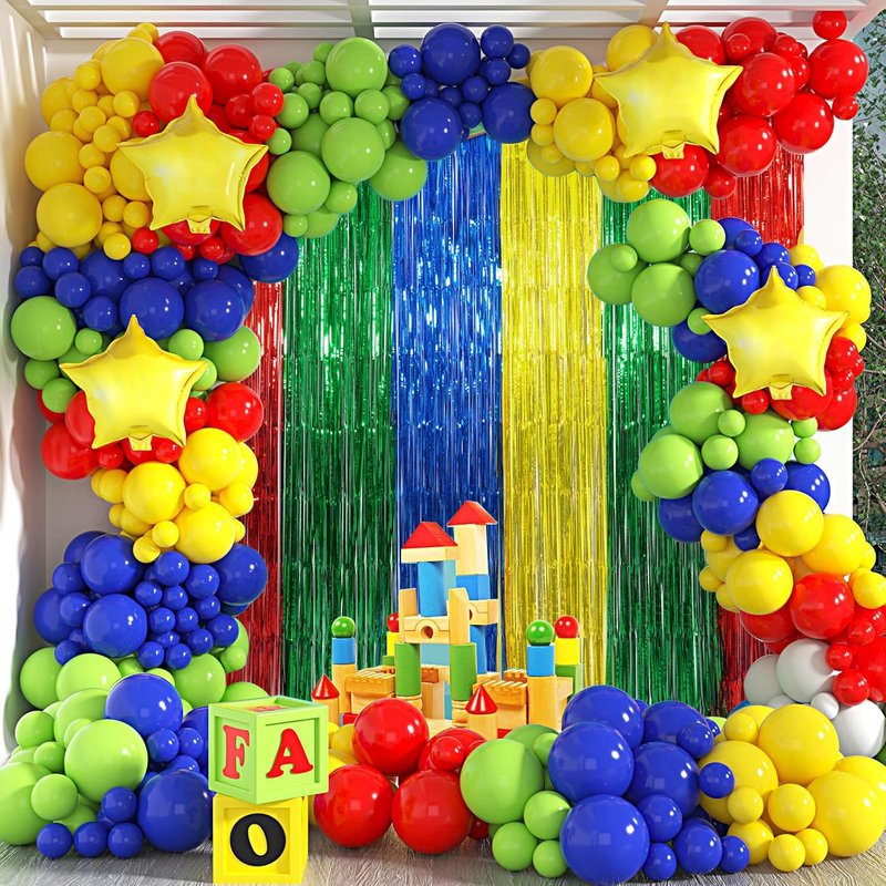 - šćAll in One PackćYou will get 2 packs of Red Green Blue Yellow Tinsel Foil Fringe Curtain, 1pc mario themed happy birthday banner, 16pcs latex balloons in blue/red/yellow/green, 2pcs star balloons, 1pc 22" yellow question mark block balloon , 1pc 18" king boo balloon, 1pc 18" super star foil balloon, perfect photo backdrop for mario themed party decoration and home decor.