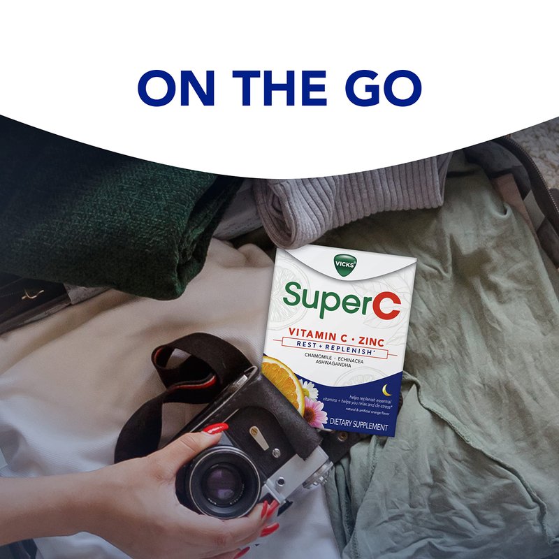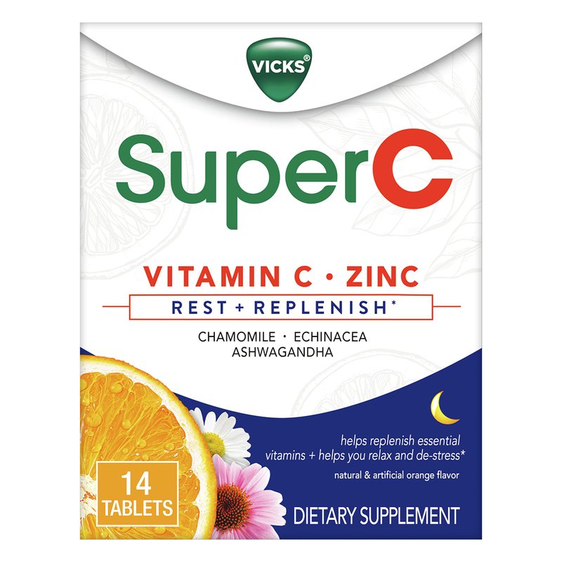- REST AND REPLENISH*. Vicks Super C Rest + Replenish* helps replenish essential vitamins + helps you relax and de-stress*. Each dose is formulated with Vitamin C, Zinc plus a complementary botanical blend with Ashwagandha