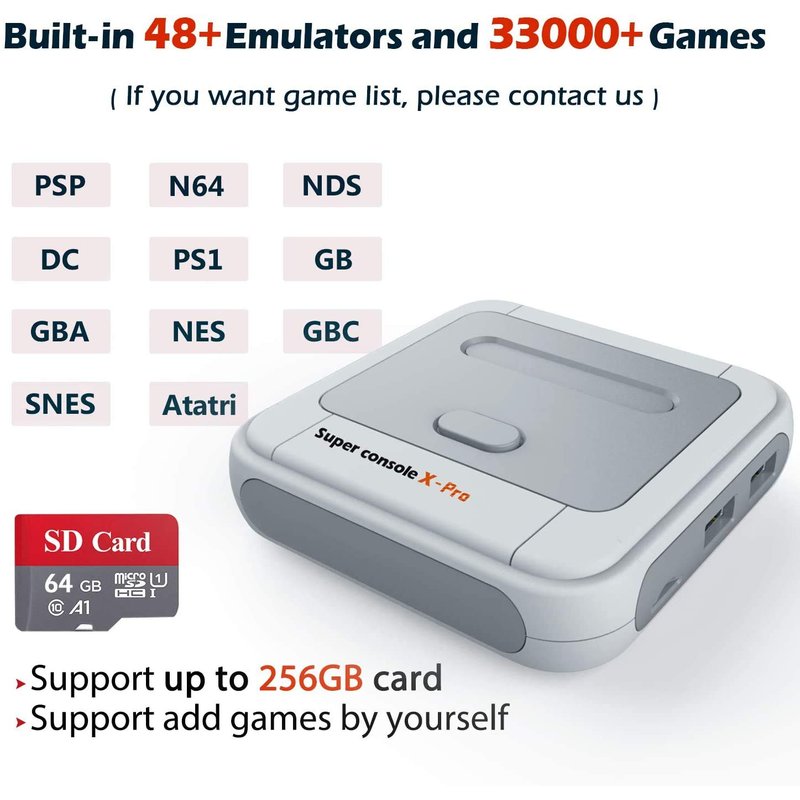 Super Console X-Pro Video Game Console with 64GB SD Card, Built in 30,000+ Games, with 2 Wireless Gamepads, Game Consoles for 4K TV Support HDMI/AV Output, LAN/WiFi, Open Linux System