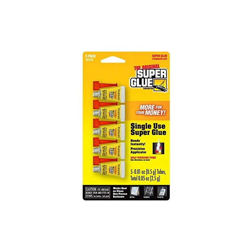 The five mini tubes, filled with original formula super glue, are perfect for small projects requiring a super strong, fast-setting adhesive. The nozzle tips easily screw on to the tube enabling precision application into tight, hard to reach locations. The single-use .5g tubes stay fresh making them the perfect tool for hobbyists, craftsmen and women, and specialists who depend on Super Glue’s quick-setting, super strong bond for their projects, yet only need a small amount at a time.