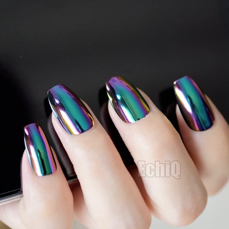 Super Holographic Blue Purple Coffin Nails Mirror Chrome Square Ladies Fake Nails Quality Tips for fingers Z905