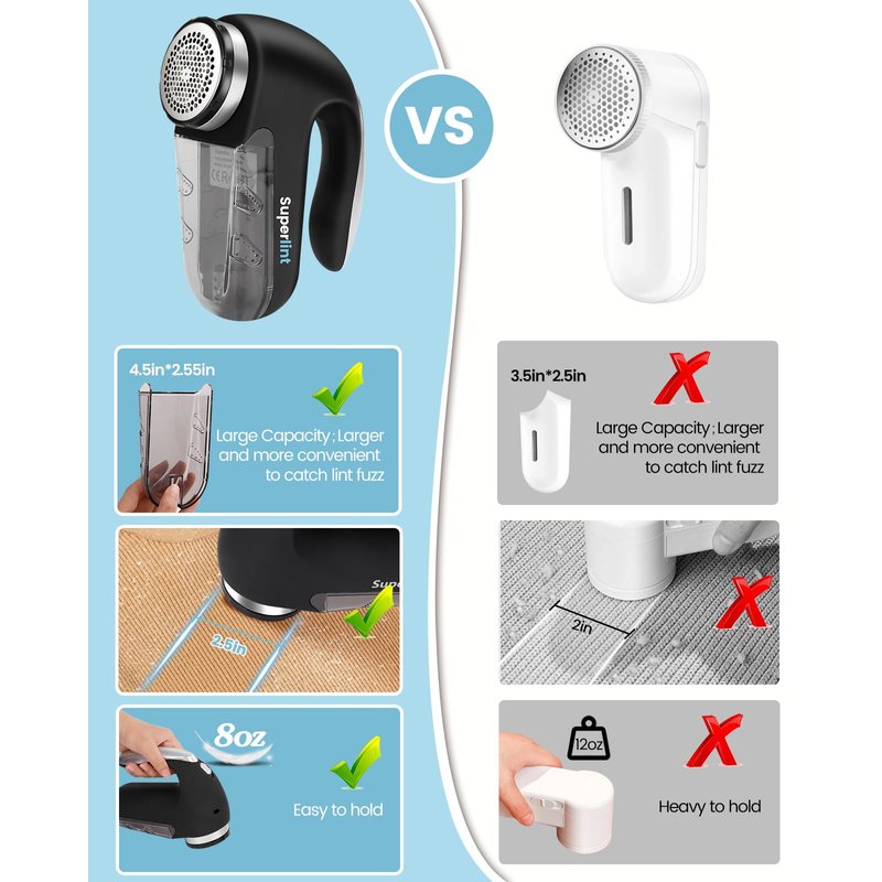 - FEATURES & BENEFITS: The sleek matte finish design shaver with a 2.5 inches shaving head that has 3 different sizes of mesh for trimming of lint, pill, fuzz of all sizes. It also with a comfortable grip handle and extra large lint collector. The blade is replaceable. And the shaver with a safety lock design. If you or your children opens the shaving head accidentally, the safety lock will start and the blades will not turn.