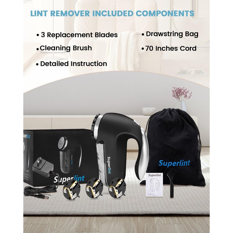 - LINT REMOVER INCLUDED COMPONENTS: SuperLint electric shaver with stainless steel rotary blades, A/C adapter with 70 inches cord and a detailed instruction. Plus bonus FREE cleaning brush for easy bobble removal & 3 PCS FREE spare replaceable stainless steel blades & FREE plush drawstring bag for stylish storage. It comes in a color box, making it the ideal gift for friends and familys.