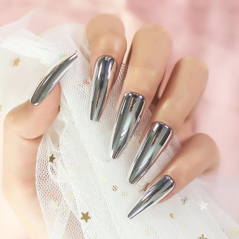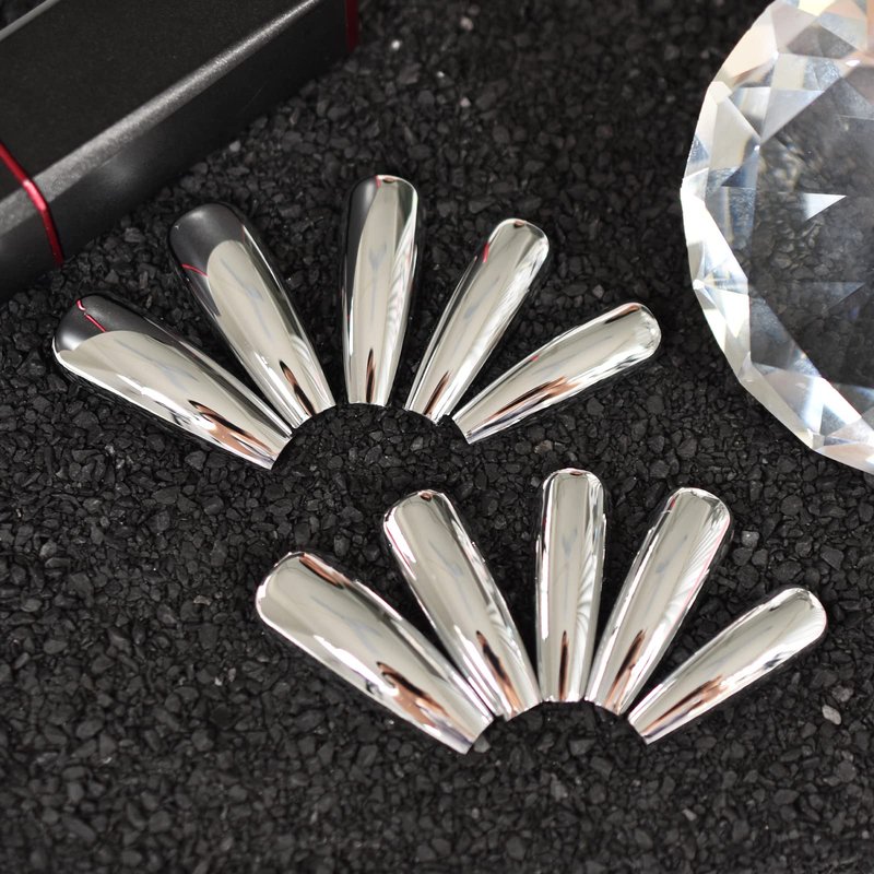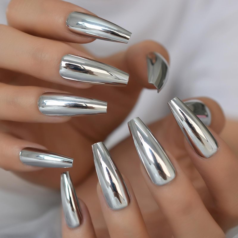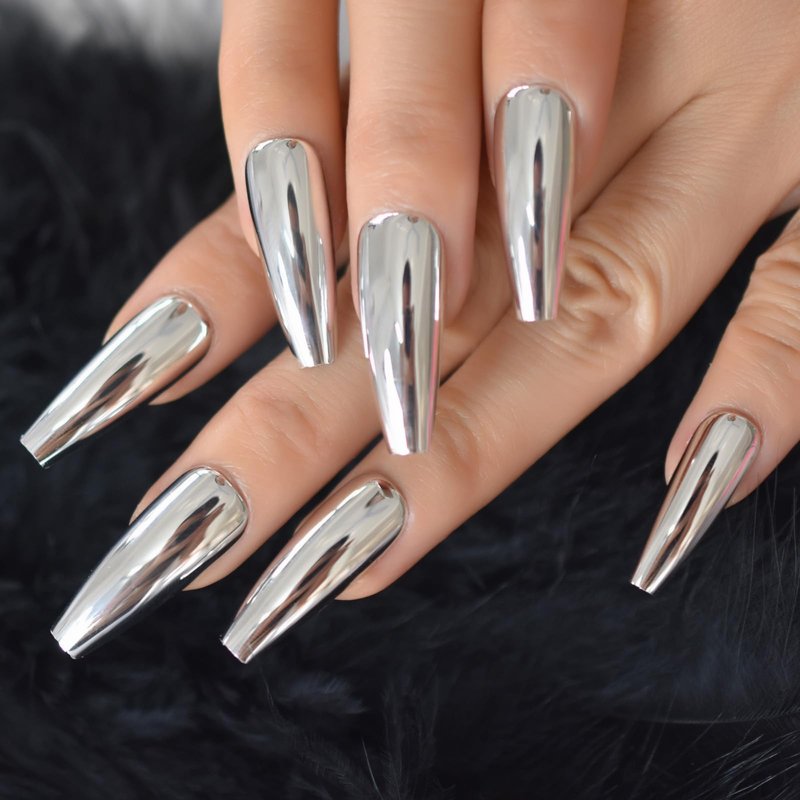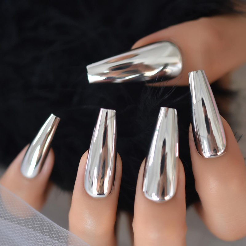 - 1. About the nails- Coffin Ballerina Press on Nails, Reflective Mirror Shiny Metallic Silver Fake False Nails, Super Long Punk Style, make you more charming.