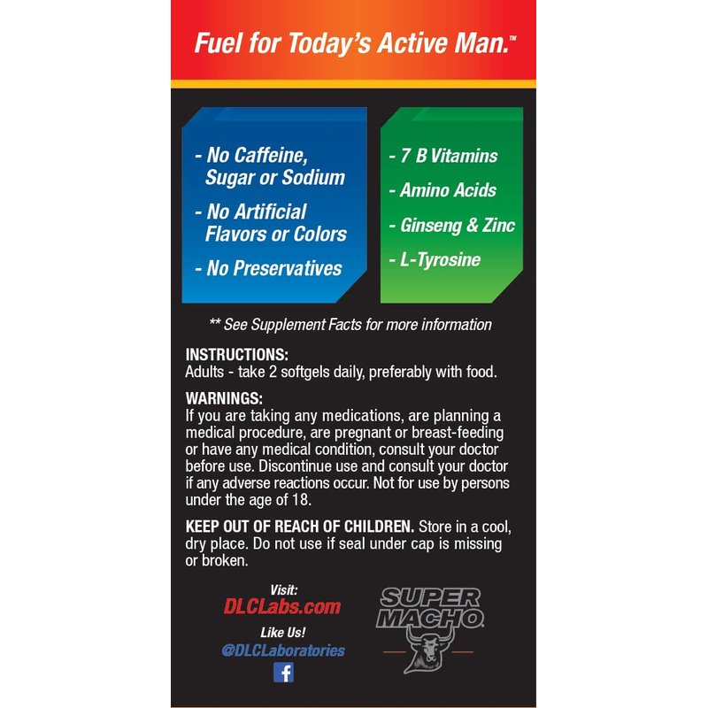 Super Macho, High Potency B Vitamins and Amino Acids, Fuel for Today's Active Men, No Caffeine, No Sugar, Dietary Supplement, Made in USA ,50 Softgels
