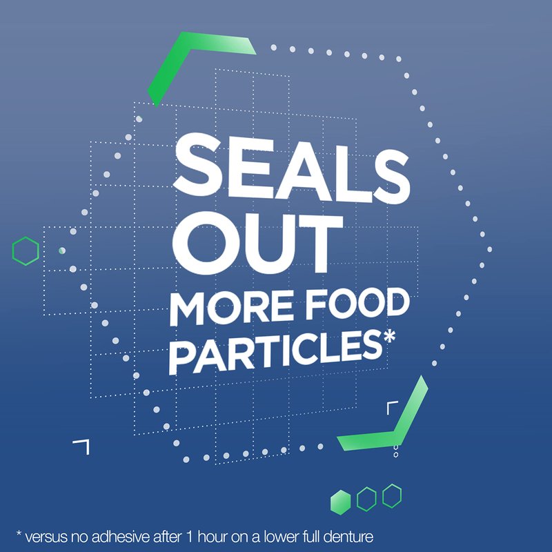 - Denture adhesive that prevents food particles from getting trapped under your dentures