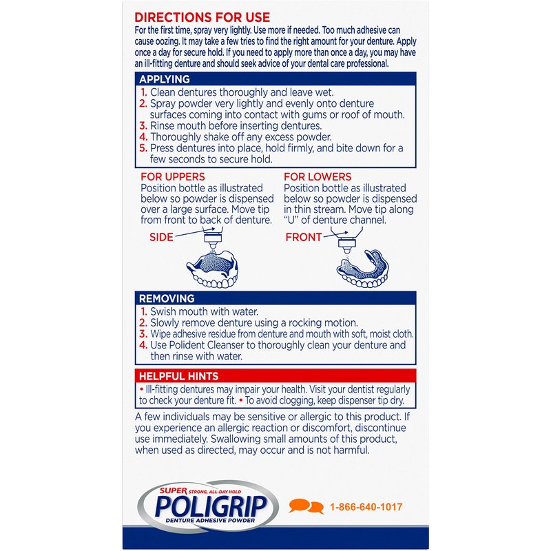 - Poligrip denture powder adhesive holds your dentures in place all day long